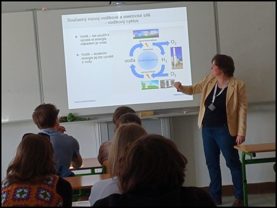 Velmi zajímavé povídání na téma získávání a ukládání elektrické energie z různých zdrojů si vyslechli studenti 3.A a jednoletého semináře z fyziky. Zavítala mezi ně Ing. Lenka Stachová, Ph.D. z Katedry elektrotechniky a počítačového modelování Fakulty elektrotechnické ZČU v Plzni. Přednáška propojovala fyzikální a chemické vlastnosti procesů. Na stavebnicových modelech palivových článků a fotovoltaických panelech si studenti mohli lépe představit, jak fungují reálná zařízení.