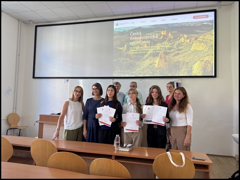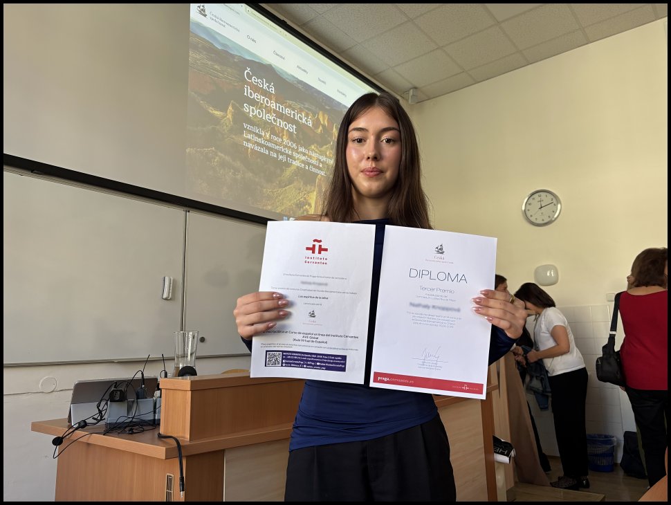 Participé en el concurso literario de la Sociedad Checo-Iberoamericana, que promueve el conocimiento y la cooperación entre Chequia y los países iberoamericanos. El tema de este año fue "La creatividad del mundo iberoamericano", y en él participaron seis estudiantes de secundaria. Los ganadores fueron: primer lugar Viola Vlasáková con Una canción y mil almas suyas, segundo lugar Stela Ester Teclová con ¡Viva la vida!, y tercer lugar yo, con Los espíritus de la selva, sobre Ino, un chico que descubre que es el último descendiente de los Kayapó y salva la selva amazónica.