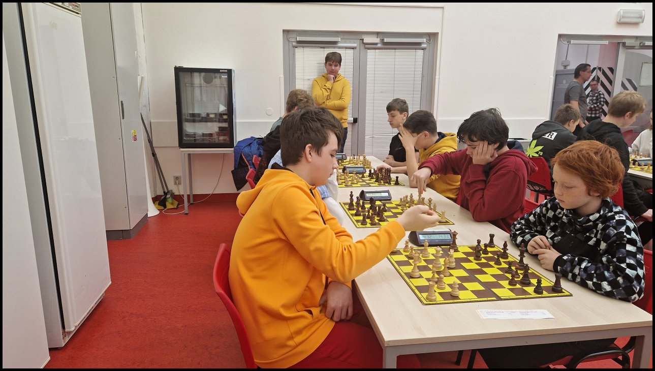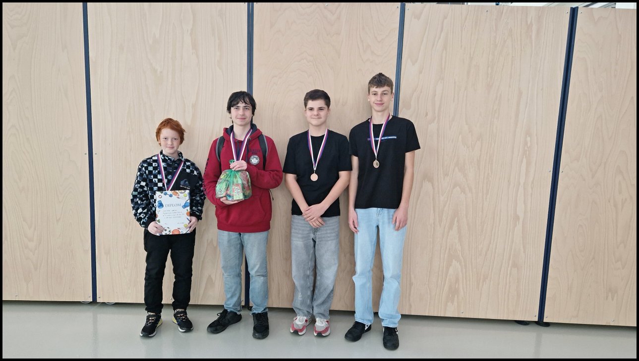 V pondělí 10. listopadu se v Techmánii konal Okresní přebor škol v šachu. Tempo hry 15 minut bylo často v koncovce dramatické a hráči lámali rekordy v rychlosti mačkání hodin ve zlomcích vteřiny... Do poslední chvíle i vývoj celého turnaje byl pro naše týmy velmi napínavý. Čtvrtý nasazený tým A ve složení: Tomáš Zelenka, Jakub Kešner, Vojtěch Jančík a Michal Heřman vybojovali krásné 3. místo a stříbro jim uniklo s nejmenším možným rozdílem-pouze o pomocné hodnocení PH2. Porazili dokonce 3. nasazené Masarykovo gymnázium. Navíc primán Tomáš Zelenka byl nejmladší hráč na 1. šachovnici a zřejmě i v celé kategorii středních škol. První dva týmy postupují do krajského kola, ale my pevně věříme, že by naše družstvo A mohlo získat divokou kartu a tím šanci utkat se ještě v Krajském přeboru o postup na Mistrovství České republiky, které se každoročně koná ve Zlíně na konci června.