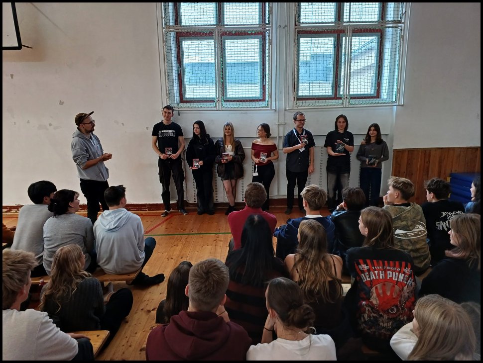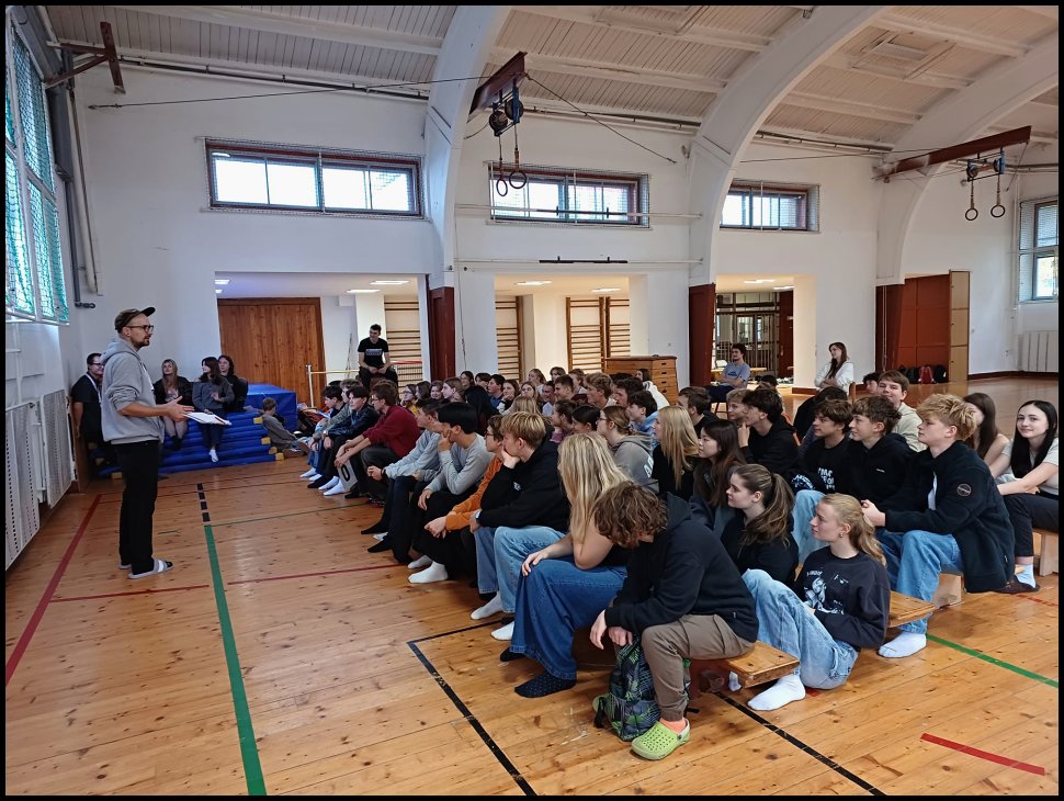 Že poetická tvorba není jen reliktem zašlých dob a doménou dávno zemřelých umělců ukázala 16. října výběru žáků našeho gymnázia návštěva slamerů pod patronátem městského obvodu 4. Jelikož běžnou součástí slamových akcí je souboj o nejlepšího performera večera, proměnila se během třetí a čtvrté hodiny školní tělocvična v kolbiště výřečnosti a studentům v improvizovaném hledišti připadla nezbytná role porotců. Oproti běžným slamovým večerům ale přeci jen došlo k jedné změně – nepostavili se proti sobě jednotlivci, nýbrž týmy, které byly stejnoměrně zastoupeny žactvem a návštěvnictvem, tedy „cizáky”. Za naši školu se do boje vydaly žačky pod pseudonymy Stázi a Jarda, za profesionály Aljaška a Sigfried. Celou akcí provázel a bavil ostřílený matador českého slamu Dr. Filipitch, potlesk ale sklidily i předskokanky, jimž připadla nelehká úloha otevírat svými příspěvky jednotlivá soutěžní kola. Této role se bravurně zhostily žačky 3.E Vrána a Katastrofa. Přestože gymnazijní tým ukořistil až stříbrné místo, atmosféře v sále to nijak neuškodilo. Texty, které se pohybovaly v polohách humorných, osobních, dojemných i ryze absurdních, dokázaly studenty rozesmát, ale i donutit k zamyšlení nad hlubšími tématy a nic na tom nezměnil fakt, že se pro naprostou většinu přítomných jednalo o první setkání s žánrem slam poetry. „Líbilo se mi, že v každém textu byl kousek duše každého člověka,” zhodnotila vystoupení E. Emingerová z 2.E a doplnil ji její spolužák J. Hojer: „Byl jsem ohromen, co všechno dokáží lidé vymyslet za vtipný, ale zároveň i poetický text.” Největším bodovým ziskem byla nakonec odměněna slamerka Aljaška, což pro ni znamenalo povinnost přednést ještě třetí, závěrečný text (který se pravděpodobně svou tematikou všem přítomným nadobro vryl do paměti).