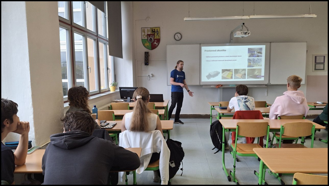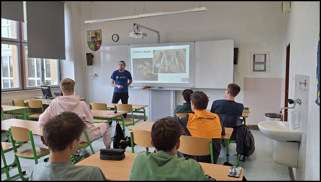 V pátek 10. října 2025 přišel mezi studenty 6.L Ing. Stanislav Bouzek z FEL ZČU z Katedry materiálů a technologií. Zajímavým způsobem přednášel studentům o zvuku a rozšířil tak jejich znalosti z této oblasti. Nemalý prostor byl věnován i přiblížení výzkumů a návrhů, které na katedře prováděli, např. návrh akustického řešení hudebního salonu v Tech Tower. Studenti byli vyzváni k případné spolupráci s katedrou, která může vyvrcholit prací SOČ.